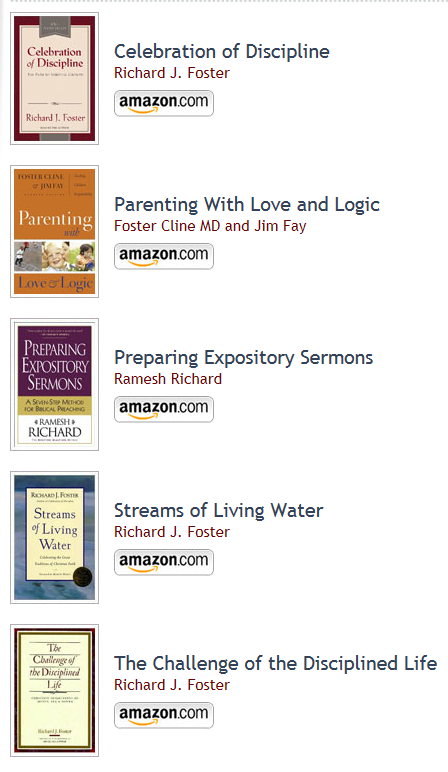 I will say I did find it quite odd that we would find the following books by Richard Foster: Celebration of Discipline, Streams of Living Water and The Challenge of the Disciplined Life.