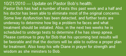 UPDATE ON HEALTH CONCERNS FOR PASTOR BOB DEWAAY