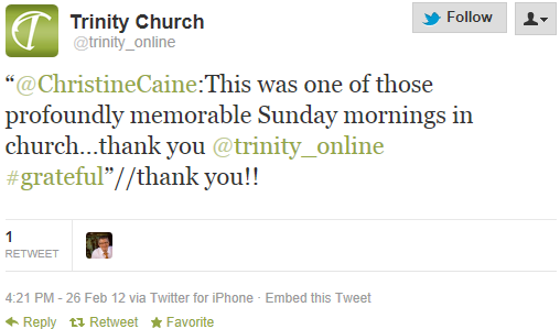I’ll explain what Caine meant when she told Shirer “see you at Colour” in a moment. First however, obviously Trinity Church was impressed with their special guest pastrix: