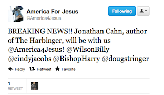 Source Cahn was questioned about this appearance by radio host Brannon Howse ofWorldview Weekend on his 3 July 2012 show and replied that he was unaware of the beliefs of the people hosting the event, or of the beliefs of the other speakers present. Cahn also noted that he was unfamiliar with the teachings of the New Apostolic Reformation. He was there, he said, to deliver his message of The Harbinger, and he left after doing so. This is most certainly an acceptable explanation, and this article does not intend to imply that Jonathan Cahn is actively involved with or in agreement with the heretical teachings of the NAR. Unfortunately, too many people are unaware of precisely what the NAR is and are ignorant of the names associated with this dangerous movement. However, one would hope that, after being confronted and challenged about his appearance at Passover 2012, Jonathan Cahn would have taken some time to re-evaluate and research the New Apostolic Reformation. One would also presume that he might be a bit more careful about the events he promotes in the future. However, it seems as though this may not be the case, as America for Jesus asked Cahn to create a promotional video for their event: