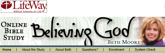 As I said before, I happen to have the series this is taken from. It comes from her 2002 Believing God (BG), which as you can see below is still promoted by Lifeway, the publishing arm for the Southern Baptist Convention: